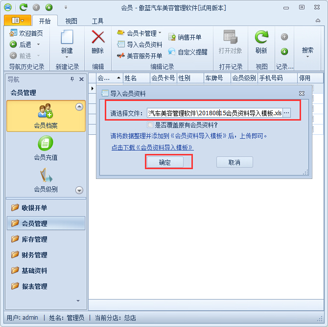 ④修改完成,就可以在傲藍(lán)洗車店會(huì)員管理軟件導(dǎo)入會(huì)員資料中選擇該excel表格將資料導(dǎo)入到軟件中,如圖: