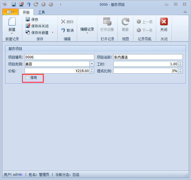 ②當(dāng)不需要再銷售該項(xiàng)服務(wù)嗎,可做停用處理,銷售開(kāi)單時(shí)就不會(huì)出現(xiàn)該項(xiàng)服務(wù)選項(xiàng),又不影響之前業(yè)務(wù)的數(shù)據(jù)分析。