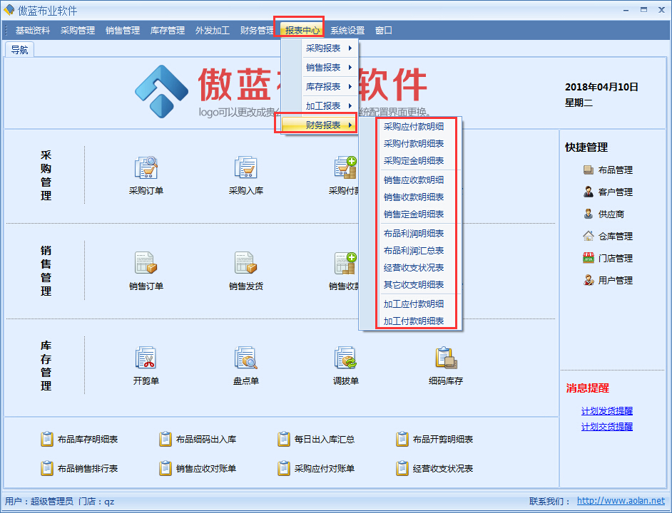 在傲藍布匹銷售管理軟件的財務管理模塊中做了很多財務管理的各種明細報表,比如:采購應付款明細、采購付款明細表、供應商訂金流水、銷售應收款明細、銷售收款明細表、客戶訂金流水賬、經營收支狀況表、其他收支明細表、加工應付款明細、加工付款明細表;詳細的財務報表中心,通過各個財務明細報表了解客戶或供應商的收費情況及店鋪經營的數據報表。
