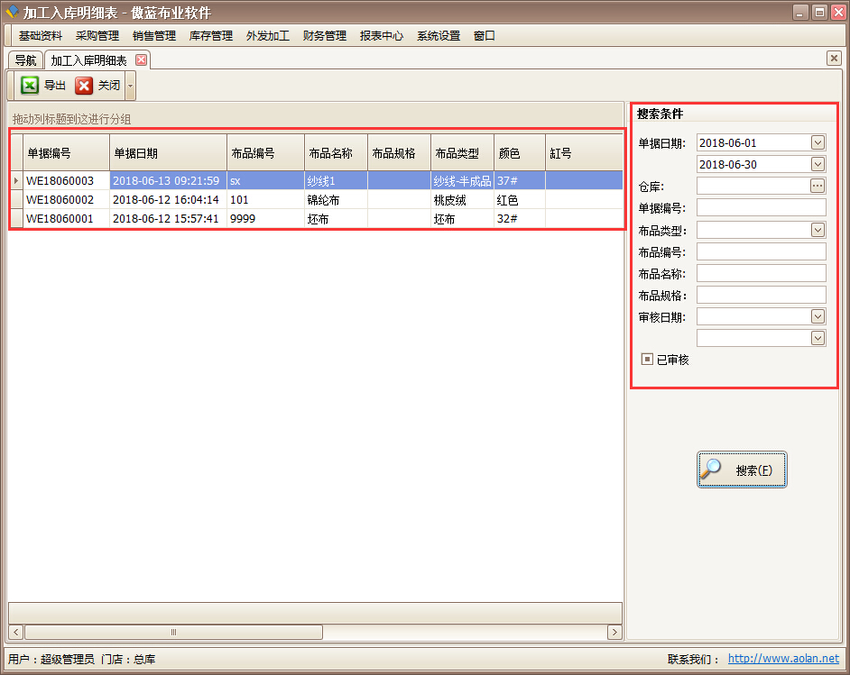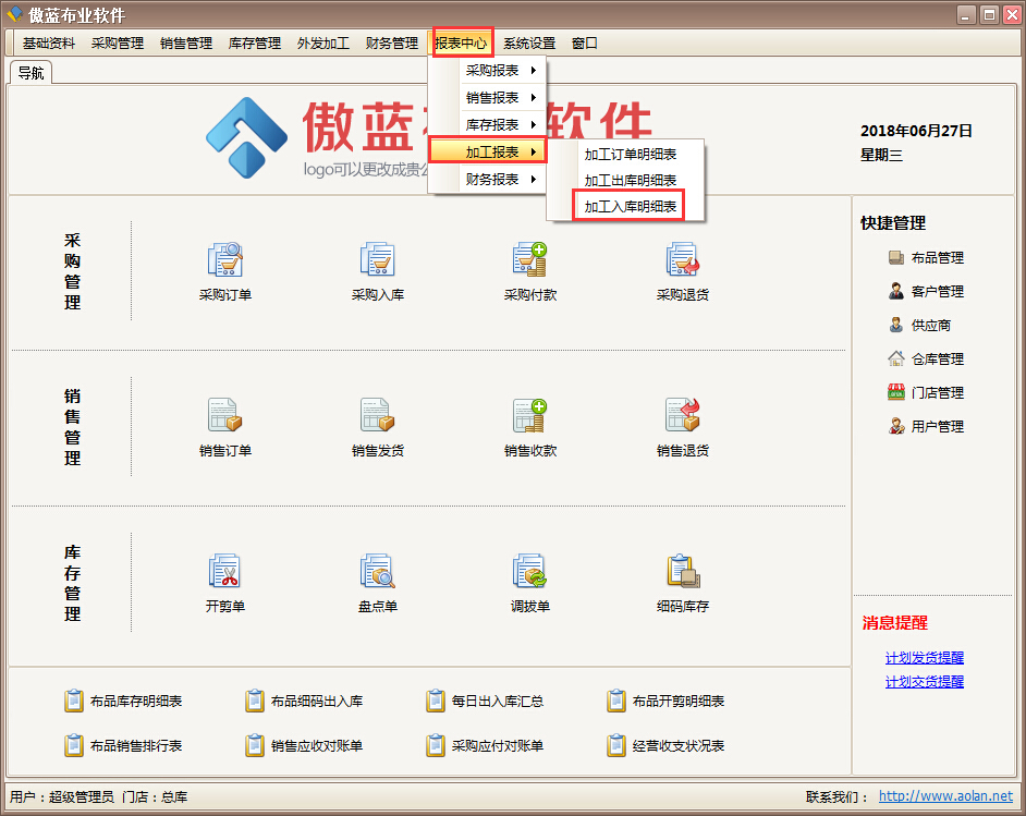 傲藍(lán)布業(yè)管理軟件查看加工入庫的布匹情況報(bào)表: