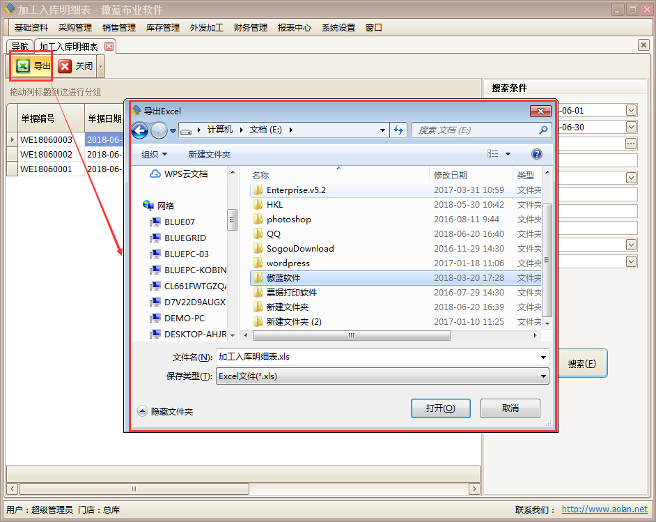 導(dǎo)出是把當(dāng)前列表中所有的記錄以 Excel 表格方式導(dǎo)出。在加工入庫明細(xì)表列表界面上,點(diǎn)擊【導(dǎo)出】按鈕。