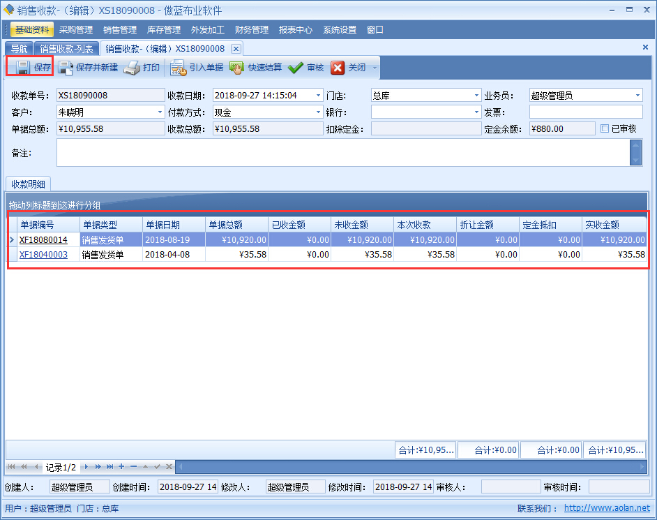 傲藍布匹銷售管理系統,銷售收款單主要是針對銷售發貨時應收的貨款,同樣,收款單也支持一次性收取多批單據費用。銷售收款單包括單據日期、客戶、付款方式、發票、銀行、收款金額等信息。明細列表中是每筆采購單的單據金額、已付金額、未付金額、扣除定金、折扣金額、實付金額等信息。