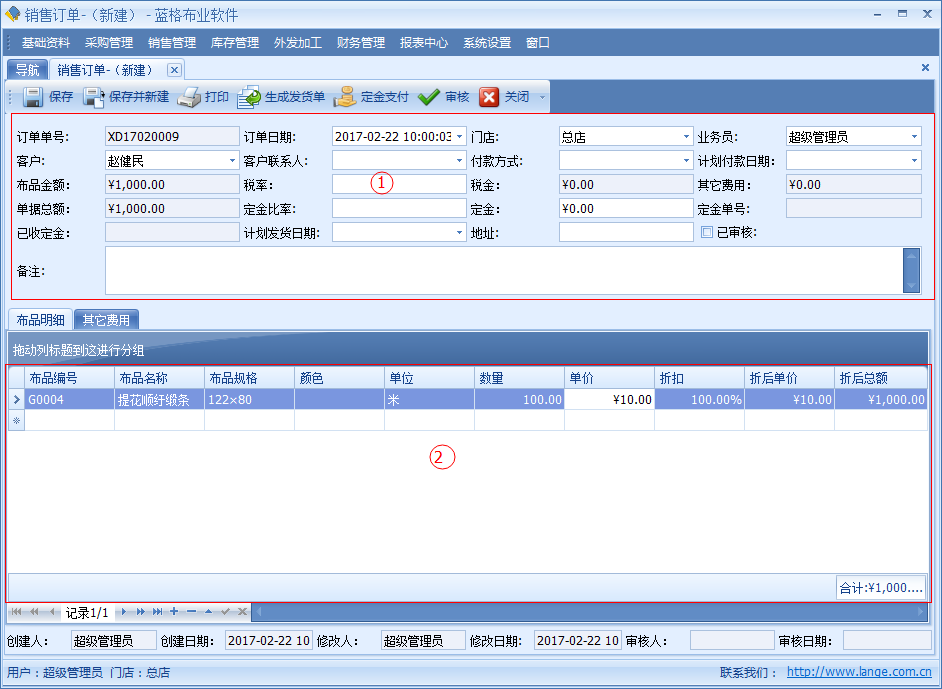 傲藍布料銷售軟件銷售訂單管理,銷售訂單主要是用于,銷售時按照客戶所需要的布品,進行登記。在銷售訂單中錄入銷售訂單,銷售訂單的信息包括開單日期、客戶、聯系人、付款方式、金額、定金、稅率、稅金等信息。明細數據中是該單據銷售布品名稱,顏色,單位,數量價格等詳細數據。