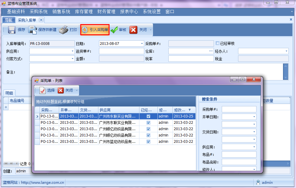 在傲藍布業(yè)管理系統(tǒng)各個子系統(tǒng)層次分明,流程式的操作簡單而且方便。如采購系統(tǒng)包括采購訂單,采購入庫,采購退貨,采購付款四個子功能。銷售系統(tǒng)包括銷售報價單,銷售訂單,銷售發(fā)貨,銷售退貨,銷售應收五個功能。各個子系統(tǒng)中功能操作簡單并且可以直接引入上一個功能的數(shù)據(jù)。如采購入庫就可以導入采購訂單中的數(shù)據(jù),采購退貨可以導入采購入庫的數(shù)據(jù),這樣不僅減少了錄入操作,還把各單據(jù)關聯(lián)起來。如圖: