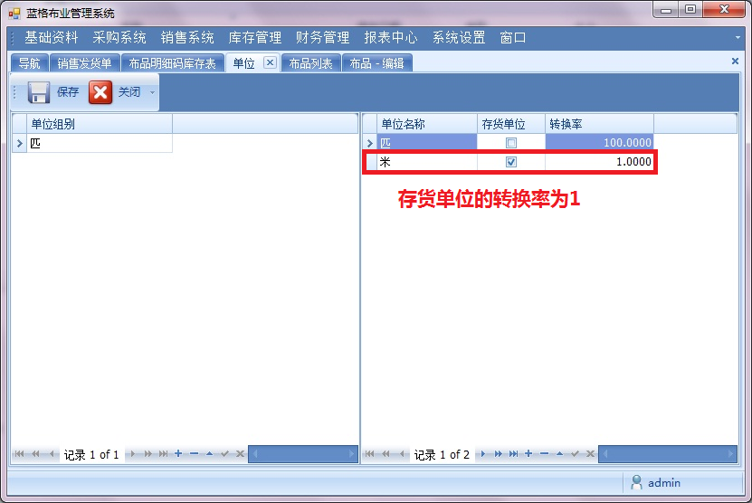 在【基礎資料】【單位】里設置軟件所用到的兩個單位,倉庫的存貨單位設置轉換率為1 。