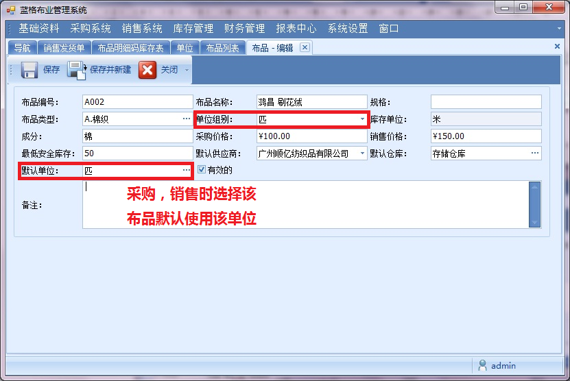 傲藍布業(yè)紡織管理軟件在設計時引入了明細碼,在出庫入庫時可以設置兩單位的換算比率,在報表統(tǒng)計中也同時體現(xiàn)兩個單位。這樣可以很清楚的看到每筆單據(jù)布匹出庫入庫的匹數(shù)、米數(shù),以及現(xiàn)在庫存不同明細碼的匹數(shù)和米數(shù)。輕松的解決布業(yè)紡織行業(yè)中多種計量方式問題,如“匹”、“碼”、“米”、“公斤”而這些計量方式有固定和不固定的換算比率。“碼”和“米”固定的換算比率,而“匹”、“公斤”跟其它單位則沒有固定的換算比率。