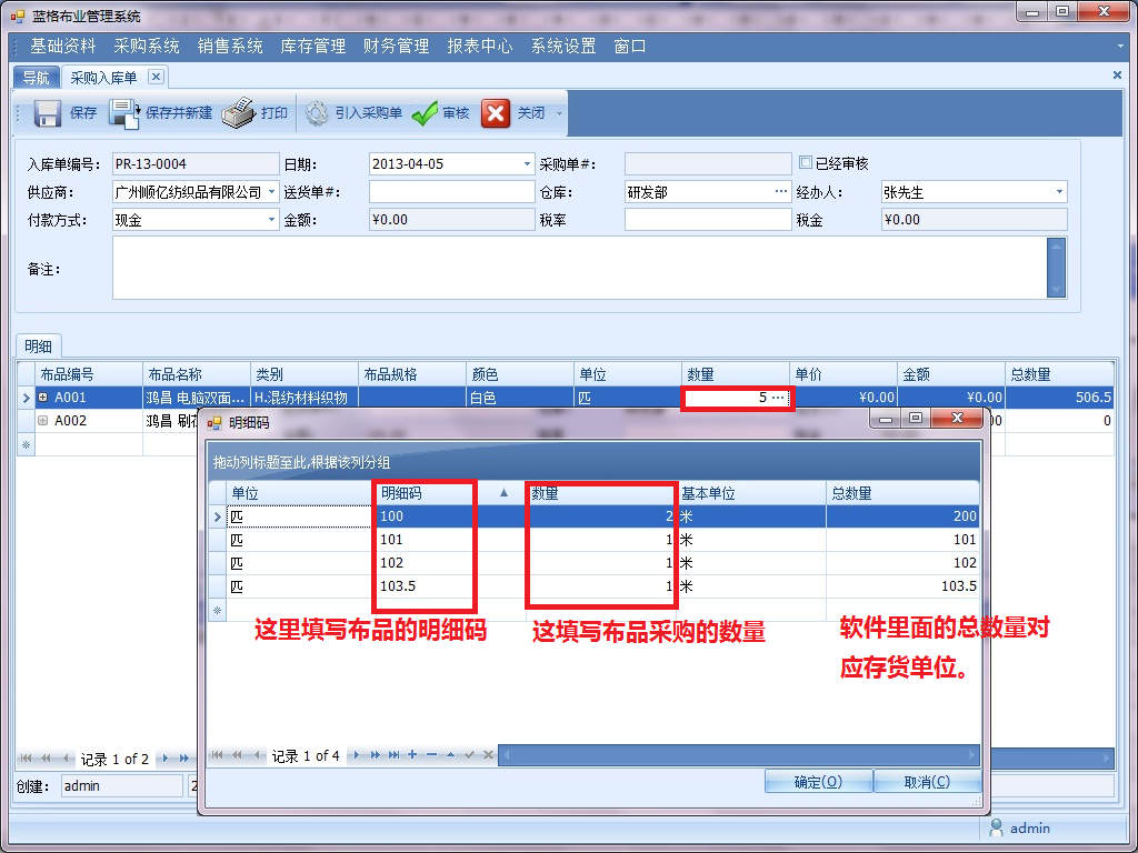 采購進貨時錄入布匹明細碼以及該明細碼進貨的數(shù)量,系統(tǒng)自動計算庫存單位數(shù)量并核算整匹的匹數(shù)量。軟件中清楚的顯示當前進貨布匹的匹數(shù)和米數(shù)。