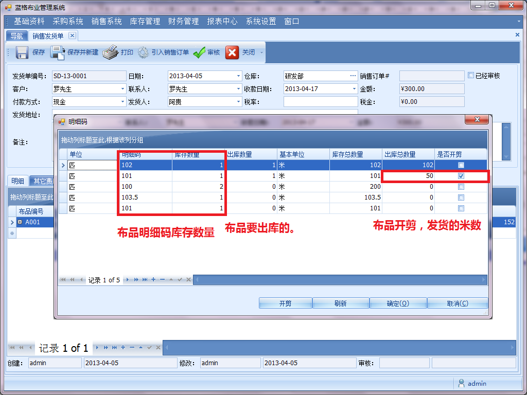 商品銷售時,系統(tǒng)可以進行開剪業(yè)務, 在開剪業(yè)務時系統(tǒng)會先拆分該明細碼的數(shù)量為1然后就可以填寫要銷售的數(shù)量。在這里可以清楚的知道當前銷售布匹的明細碼匹數(shù)以及是否開剪,當開剪時剩下的將產(chǎn)生另外一個明細碼布匹。這會在報表里和以后出庫現(xiàn)在布匹時體現(xiàn)出來。