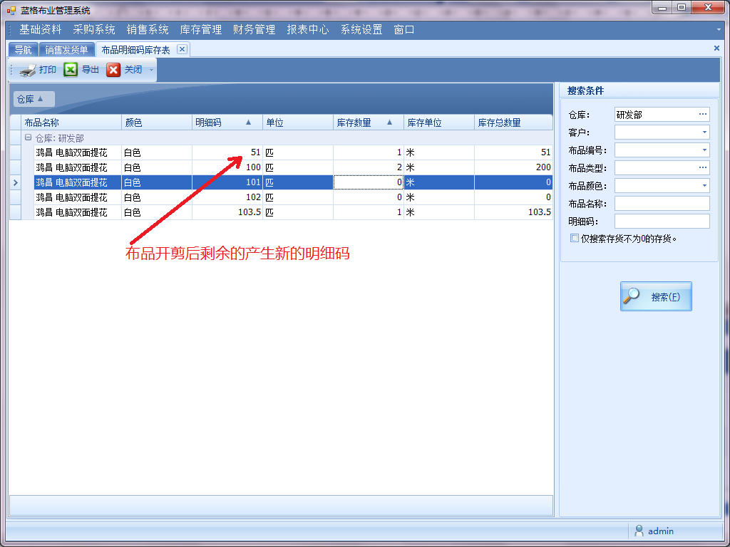 報表中心可以實時查詢到當前布匹明細碼的庫存數(shù)量。這里可以看到開單銷售時開剪剩下的布匹。
