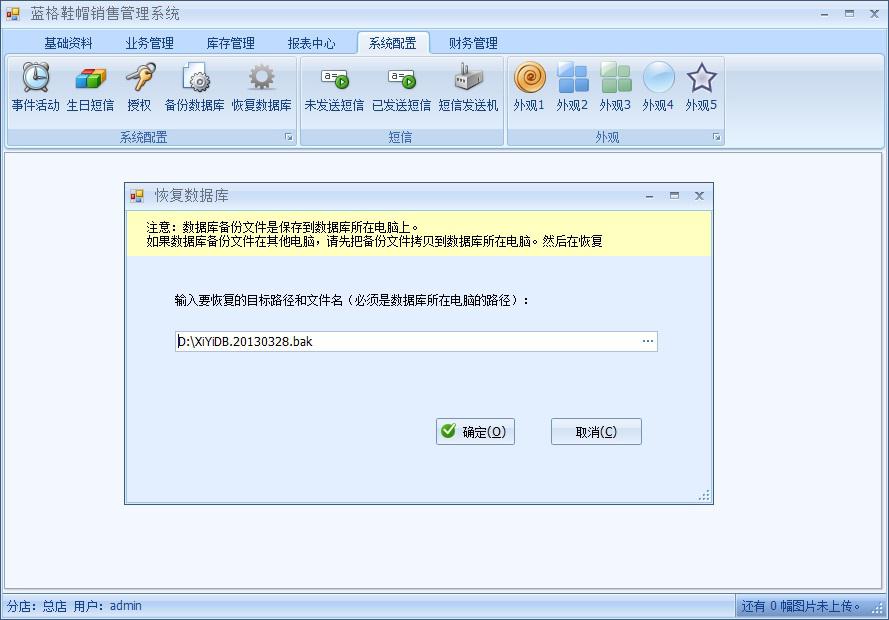 電腦在使用過程由于中病毒或者系統崩潰造成數據丟失,傲藍鞋帽銷售管理軟件提供了數據恢復功能,數據可以隨時恢復。下面介紹數據的恢復操作 登錄傲藍鞋帽銷售管理軟件后在【系統配置】導航點擊【恢復數據庫】,在彈出的恢復數據庫界面中選擇以前備份的數據庫文件,然后點擊“確定”,這樣就恢復數據庫了,如下圖: