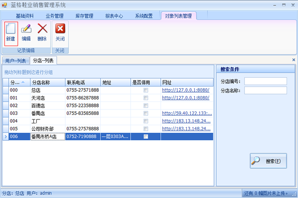 點(diǎn)擊【基礎(chǔ)資料】->【分店】打開(kāi)分店-列表,這里顯示全部的分店信息。點(diǎn)擊【新建】進(jìn)入分店配置頁(yè)面。