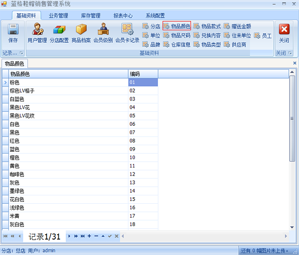 點(diǎn)擊【基礎(chǔ)資料】【物品顏色】打開(kāi)物品顏色編輯界面,在這里添加物品顏色。物品編碼是在物品生產(chǎn)條碼時(shí)加上物品顏色編碼。填寫好以后點(diǎn)擊保存。
