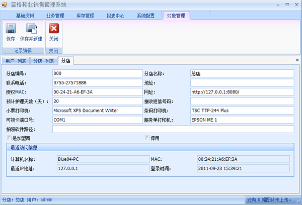 新建一個(gè)分店需要輸入分店編號(hào),分店名稱,聯(lián)系電話,地址,授權(quán)MAC等等。