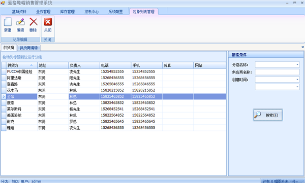 點(diǎn)擊【基礎(chǔ)資料】->【供應(yīng)商】, 打開(kāi)供應(yīng)商列表界面,該界面可以進(jìn)行查詢,查詢相關(guān)的供應(yīng)商信息,雙擊該供應(yīng)商打開(kāi)供應(yīng)商詳細(xì)信息界面。包括編輯供應(yīng)商,刪除供應(yīng)商和建立新的供應(yīng)商三個(gè)功能。如下圖: