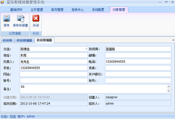 在上圖中點(diǎn)擊【新建】打開(kāi)供應(yīng)商編輯界面。添加好供應(yīng)商相關(guān)的信息。然后點(diǎn)擊【保存】這樣就把供應(yīng)商錄入到系統(tǒng)中。當(dāng)在上圖中選擇一個(gè)供應(yīng)商點(diǎn)擊【編輯】,在該界面中會(huì)顯示選擇供應(yīng)商詳細(xì)的信息,修改其中的項(xiàng)目,然后點(diǎn)擊【保存】,供應(yīng)商的信息就更新完成。