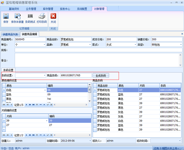 點(diǎn)擊【基礎(chǔ)資料】【物品尺碼】打開(kāi)物品尺碼編輯界面,在這里添加物品尺碼。物品編碼是在物品生產(chǎn)條碼時(shí)加上物品尺碼編碼。填寫好以后點(diǎn)擊保存。