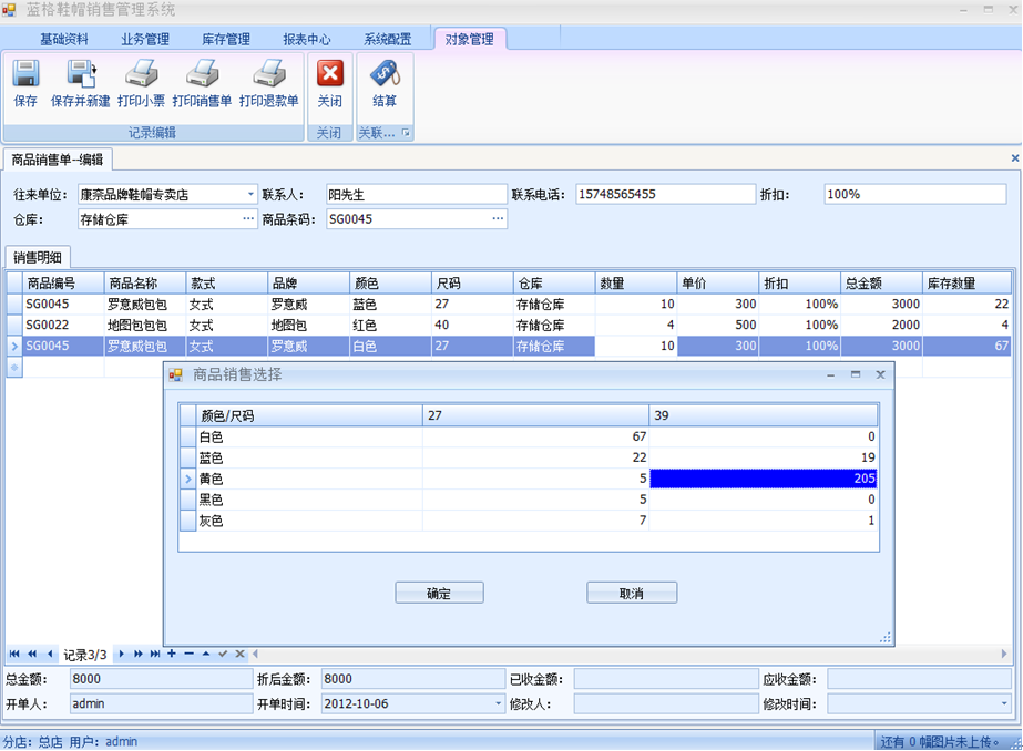 在上圖中點擊【新建】打開銷售商品單據編輯界面。填寫好單據相關的信息。然后點擊【保存】這樣就把該銷售商品錄入到傲藍鞋帽銷售管理系統中。當在上圖中選擇一個單據點擊【編輯】,在該界面中會顯示選擇單據的詳細信息,修改其中的項目,然后點擊【保存】,單據信息就更新完成。在商品條碼框中輸入商品條碼然后按回車鍵,系統會自動把該商品加入到銷售列表中,當該條碼對應多個商品時,會彈出商品選擇框,選擇詳細的商品。如下圖所示: