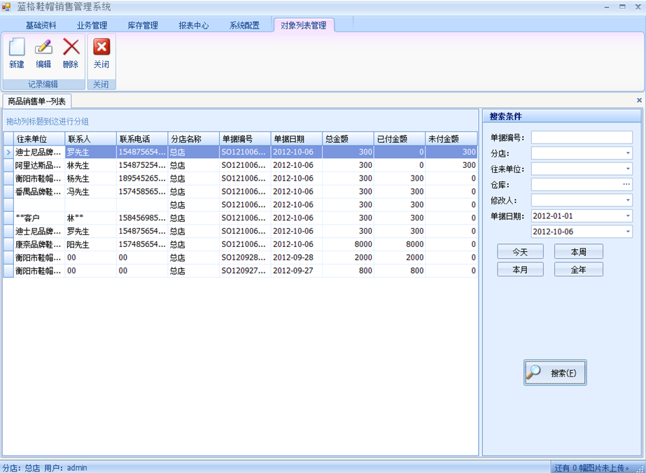 登錄傲藍鞋帽銷售管理軟件后點擊【業務管理】->【銷售列表】, 打開銷售單據列表界面,該界面可以進行查詢傲藍鞋帽銷售管理軟件中之前錄入的相關銷售單信息,雙擊銷售單據打開銷售詳細信息界面。銷售單據列表界面包括編輯銷售單,刪除單據和建立新的單據三個功能。如下圖: