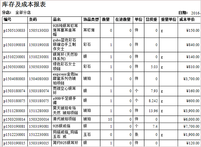 5.庫存及成本報表:指定庫存日期、分店、飾品種類、庫存種類等信息篩選查看報表,統計庫存及成本情況
