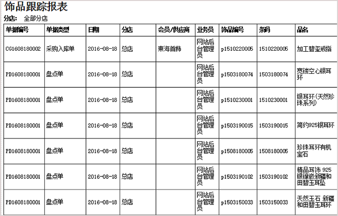 6.飾品跟蹤報表:從飾品建立信息后所產生的所有業務都能在報表內統計,可按日期、單據類型、分店、員工、會員、供應商、飾品等篩選查看。