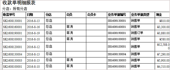 7.收款明細報表:按日期、分店、會員等篩選查看收款的日期,會員,單據編號,收款的方式,收款金額等。