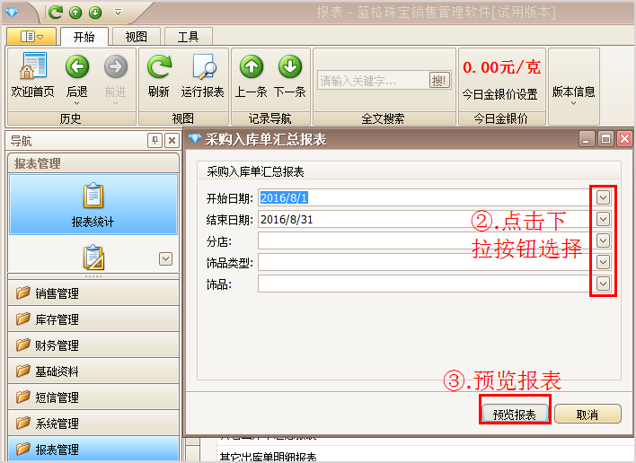 1.采購匯總報表:查看一段時間內全部店鋪或某個分店的飾品采購情況。