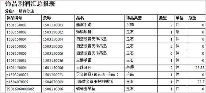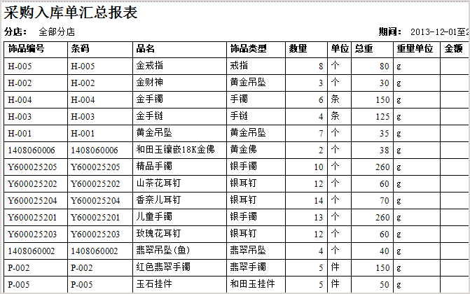 預覽的報表樣式,如下圖:主要查看指定時間段,各分店的飾品采購的數量、重量、金額等