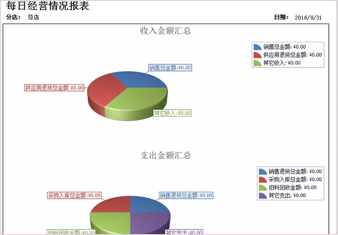 2.每日經營情況報表:以餅圖和列表的方式展現門店每日的業務收入、支出情況。支持多種格式導出和快速打印
