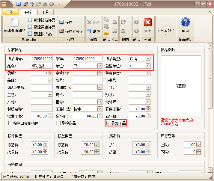 1、在基礎(chǔ)資料中新建委外加工后的成品飾品信息,點擊【基礎(chǔ)資料】【飾品】“新建飾品”填寫飾品的基礎(chǔ)信息,勾選“是加工品”表示這件飾品是委外加工完成的,在“加工原料”中選擇該飾品加工需要的原料信息,保存即可,如圖: