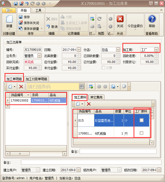 2、需要委外加工的飾品,需要庫存管理中進行加工出庫,精準(zhǔn)管理庫存中的每一件飾品。點擊【庫存管理】→【加工出庫單】→新建,在加工出庫單中確認(rèn)加工商,系統(tǒng)登記飾品出庫的具體流向,在“加工單明細(xì)”中選擇需要加工的飾品,飾品選擇之后,軟件自動帶出加工的原材料,進行同時出庫,設(shè)置好需要原料的數(shù)量,以及確認(rèn)加工原料是否有加工廠提供(若是工廠提供則在“工廠原料”下打鉤即可)原料不是工廠提供時,系統(tǒng)執(zhí)行出庫扣減庫存數(shù)量,如圖: