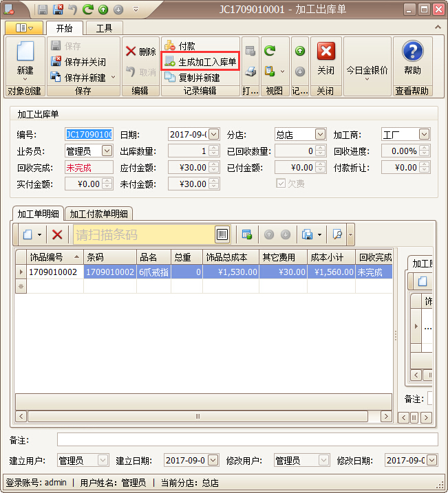 3、當(dāng)飾品委外加工完成之后,珠寶門店收到加工好的飾品,可以在傲藍(lán)珠寶首飾銷售軟件原先建立好的加工出庫單快捷建立“加工入庫單”如圖: