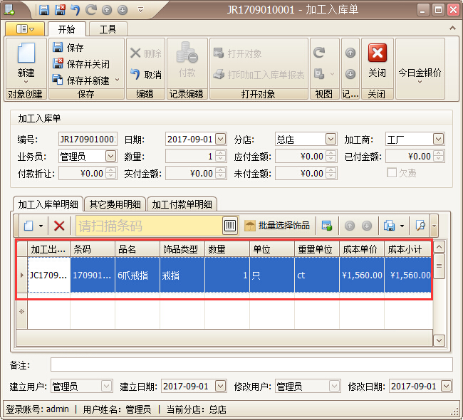 ①在加工入庫單中可以清晰的看到加工后的飾品入庫明細(xì),點擊“保存”,飾品自動添加到飾品庫存中,飾品數(shù)量自動增加,如圖: