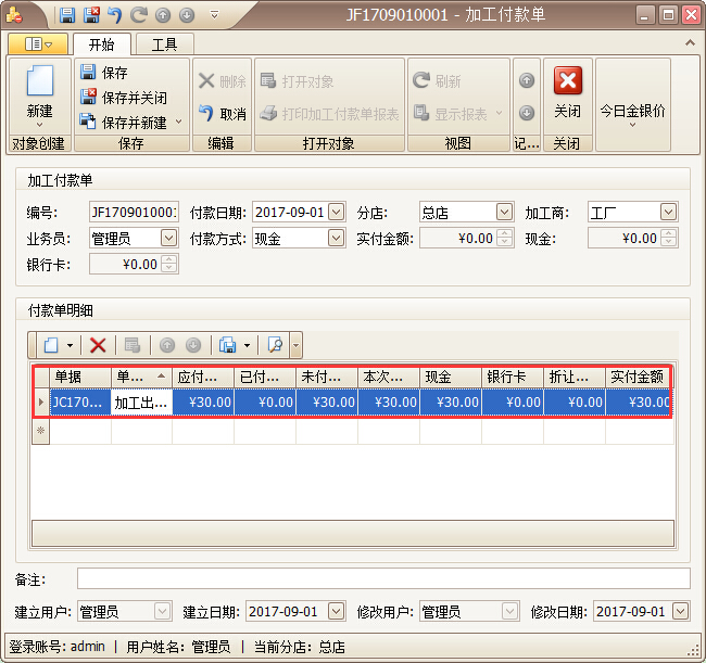 4、加工入庫單保存之后,在加工出庫單中點擊“付款”向本次加工工廠支付加工費用,軟件會自動核算本次加工費用(包含工廠原料費、加工費等),保存加工付款單后即可完成本次的委外加工業(yè)務(wù)。如圖: