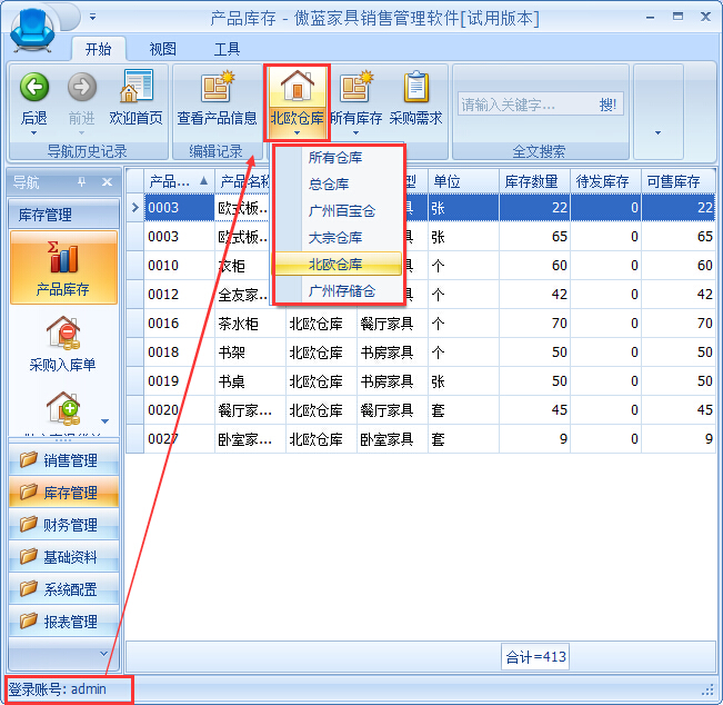傲藍家具商城管理軟件總店管理員賬號,可以查詢各個分店倉庫的庫存數(shù)量,如圖:
