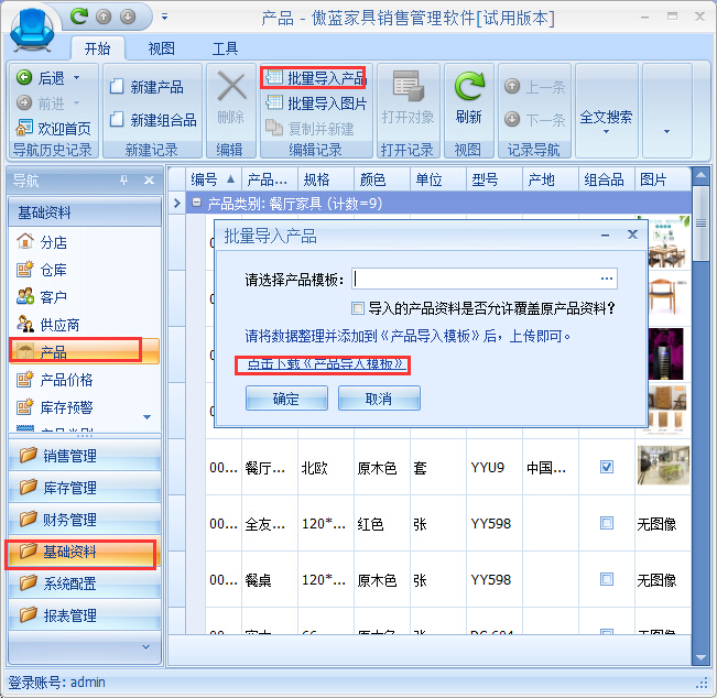 ④將修改好的家具產品資料信息導入到軟件中,點擊【批量導入產品】,選中修改后的①的產品信息表格,將產品資料導入至系統,如圖: