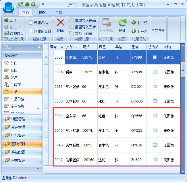 ⑤導入完成之后,傲藍家具店鋪收銀系統就會在產品資料中新增導入的產品,如圖:
