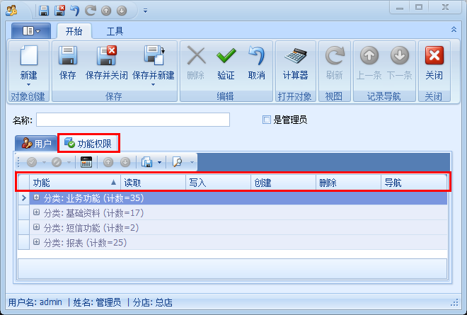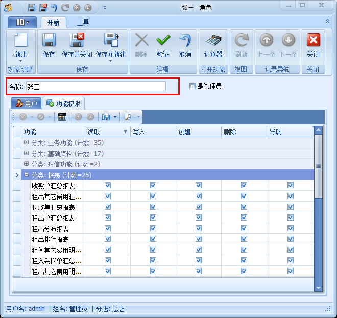 創建:打鉤表示該角色可以新建該功能或報表的新條目
