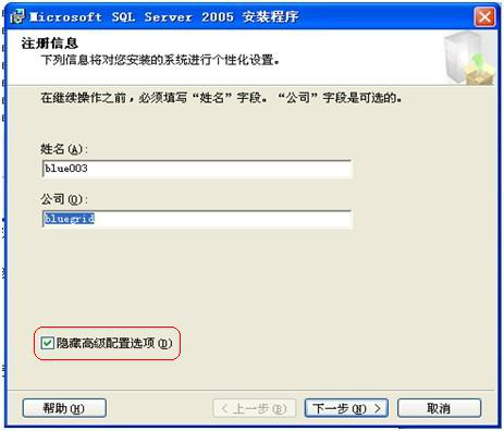 在“隱藏高級配置選項”下打勾,填上你的注冊信息(姓名,公司)點擊下一步繼續安裝。