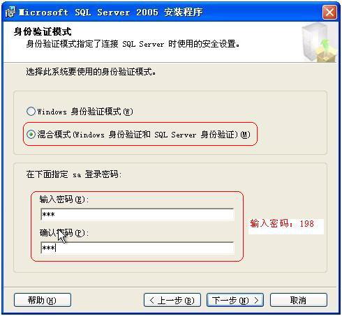 這里是設置數據庫的身份驗證模式,選擇用混合模式,并且設置sa用戶的密碼是198,點下一步繼續安裝