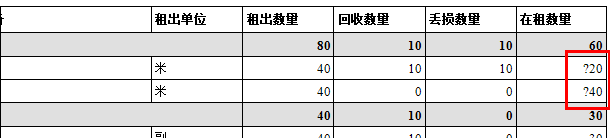 傲藍建筑租賃管理軟件當租出材料是按類別租出的時候,查看租出情況報表時,該材料的在租數量就會有一個問號在數字的前面。初始使用的用戶很多時候會不理解問號的含義,如下圖所示: