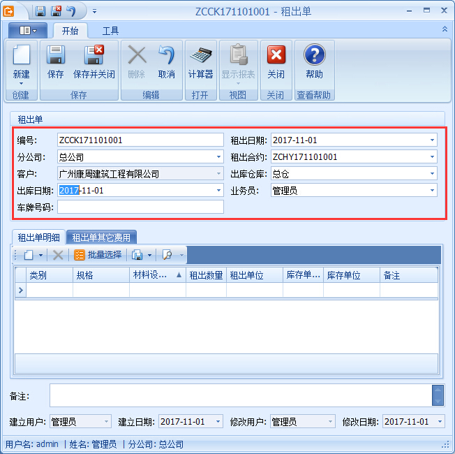 傲藍(lán)建筑租賃管理軟件租出單管理詳細(xì)登記材料明細(xì)