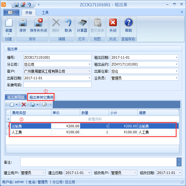②若租賃需要租賃站提供運(yùn)輸或其他裝卸材料的人工,可以“租出單其它費(fèi)用”中填寫,確定本次租賃需要的其他雜費(fèi),如圖: