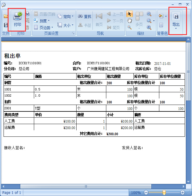 ①傲藍(lán)建筑租賃管理軟件還支持將租出單報(bào)表快速打印,并導(dǎo)出存檔,如圖: