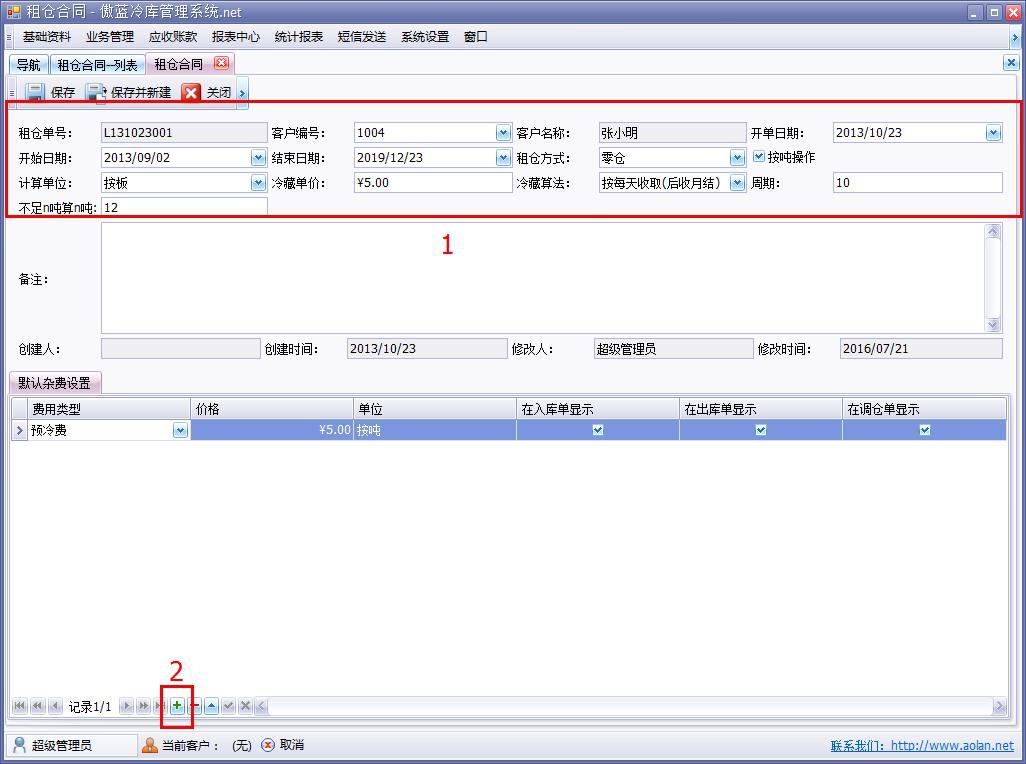 傲藍冷庫倉儲管理軟件默認費用設定是冷庫軟件可根據用戶具體的實際業務來設定默認費用,例如商品入庫單、商品出庫單、商品寄存單、過車分檢單等業務的相關費用。