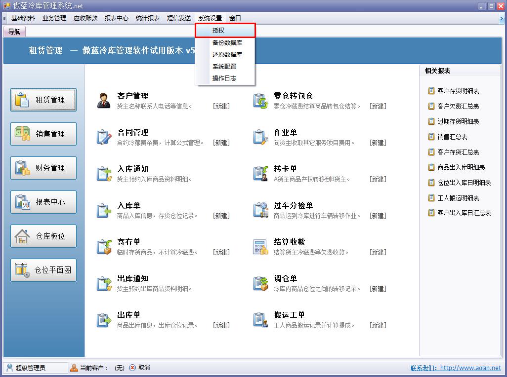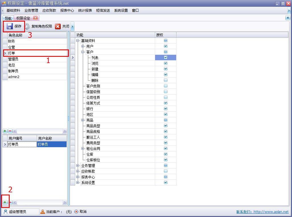 權(quán)限管理是傲藍(lán)冷庫(kù)管理信息系統(tǒng)可為不同的用戶設(shè)定使用功能模塊的權(quán)限,不同的用戶使用軟件的目的不一樣,權(quán)限用戶使用自身職責(zé)所涉及的功能模塊。