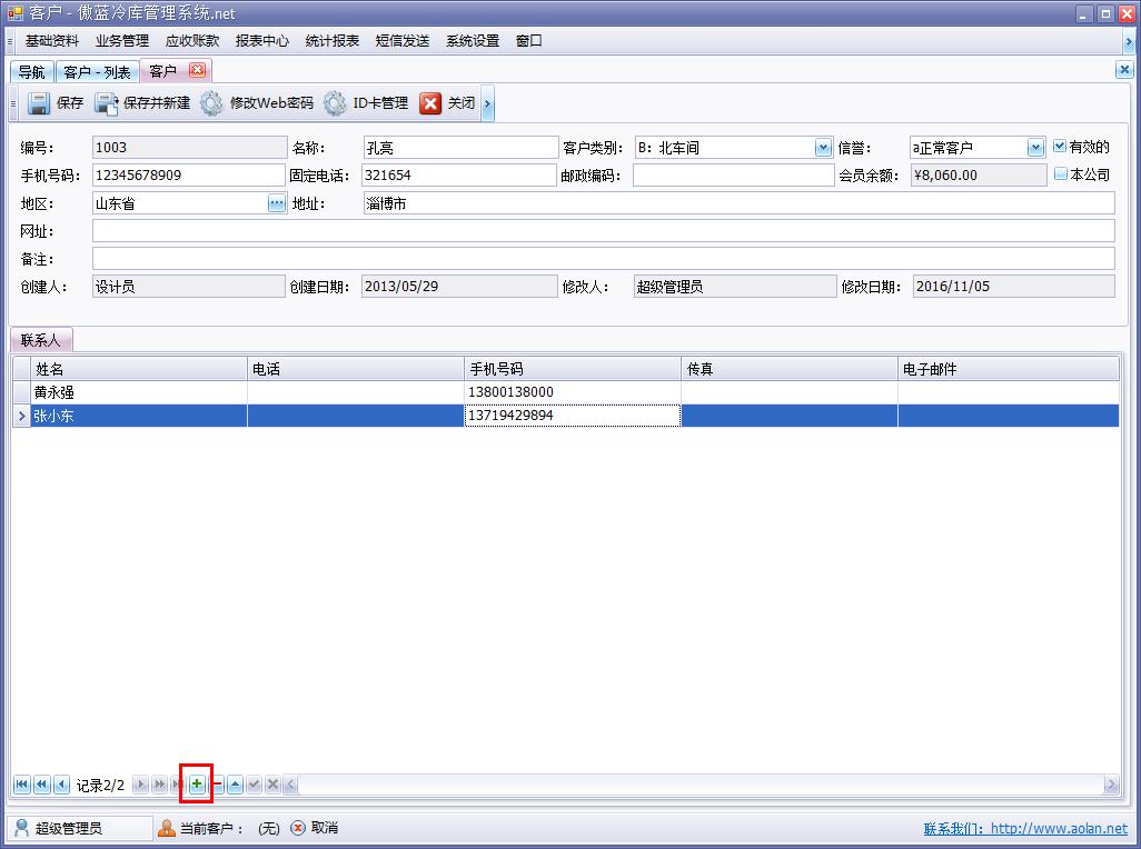 使用冷庫信息管理系統(tǒng)對客戶的一些基本信息進行錄入處理,如客戶名稱、客戶地址以及多個聯(lián)系人信息的存儲,在業(yè)務處理過程中,遇到需要聯(lián)系客戶的情況,調出客戶資料,就可相對應具體負責這項業(yè)務的聯(lián)系人,一對一地聯(lián)系溝通,避免了一些不必要的程序。