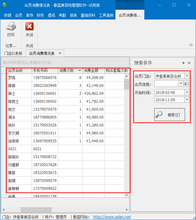 傲藍美容院管理軟件會員消費情況表可以根據會員消費次數、充值次數等數據檢索出哪些才是美容院忠誠的會員,美容院應該就消費頻率高的會員加以進一步的維護,建立長期穩定的合作關系。