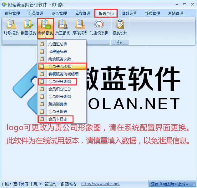 2、傲藍美容院會員管理軟件豐富的會員統計分析報表,幫助美容院管理者對會員做宏觀了解,便于做決策。