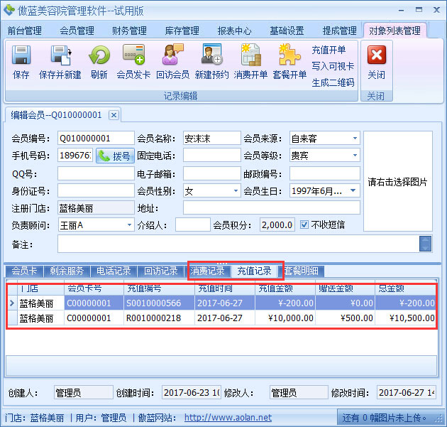 ④消費記錄和充值記錄,了解該會員在本店消費的歷史記錄,掌握會員的消費習慣,以便做下一步針對性的會員銷售,如圖: