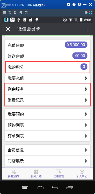 4、傲藍美容院微信會員系統,會員可通過微信公眾號了解自己的消費情況,點擊【會員中心】→【會員卡】查看使用前后的積分情況,“剩余服務”查看自己未完成的套餐服務,“消費記錄”查看自己在美容院的消息消費情況,消費透明化提升美容院的信譽度,如圖:
